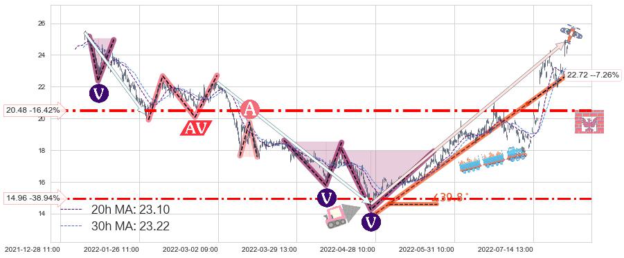 ♞ 20小时均线:23.10,30小时均线:23.22→ 快线<慢线