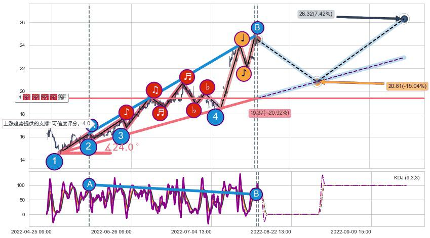 ♘ 支撑价格位22.28,可信任强度37.35%,距离最后交易2022-08-12 14:00形成的收盘价格24.50相差 -9.06%