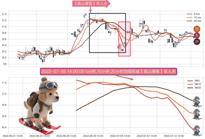 形态多维评估: ⚀ 2022-06-28 13:00:00小时-2022-07-13 13:00:00小时显现 5小时-10小时-20小时均线 【高山滑雪】买入点 看多信号,后市看涨,买入