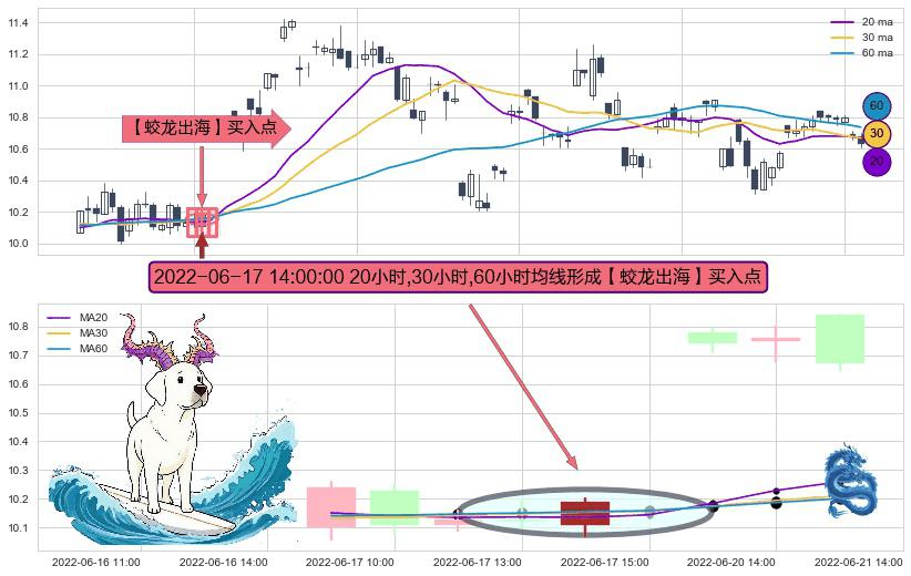 形态多维评估: ⚀ 2022-06-17 14:00:00小时显现 20小时-30小时-60小时均线 【蛟龙出海】买入点 看多信号,后市看涨,买入