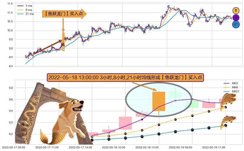 形态多维评估: ⚀ 2022-05-18 13:00:00小时显现 3小时-8小时-21小时均线 【鱼跃龙门】买入点 看多信号,后市看涨,买入