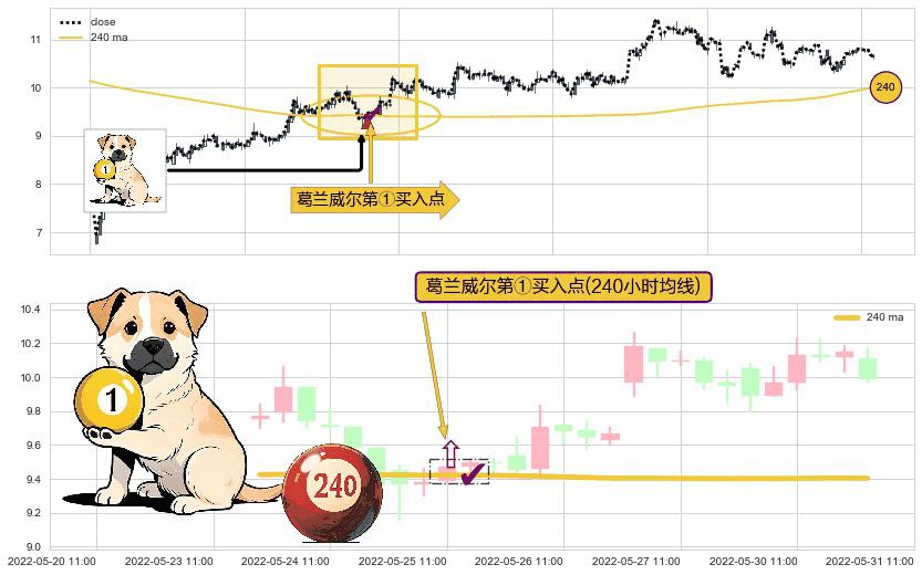 形态多维评估: ⚀ 2022-05-25 11:00:00-小时显现 葛兰威尔均线 240小时均线 第买①入点 走势反转见底信号,后市看涨,买进信号
