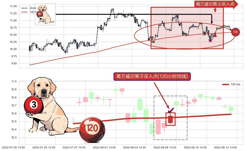 形态多维评估: ⚀ 2022-08-05 14:00:00-小时显现 葛兰威尔均线 120小时均线 第③买入点 上升趋势的中继信号,后市看涨,买进信号