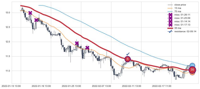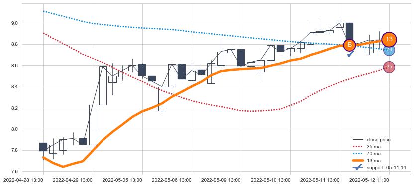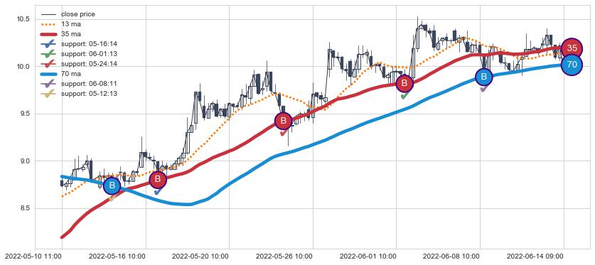 上涨趋势05-10 11:00-06-14 09:00,均线35, 70确认关键支撑5处