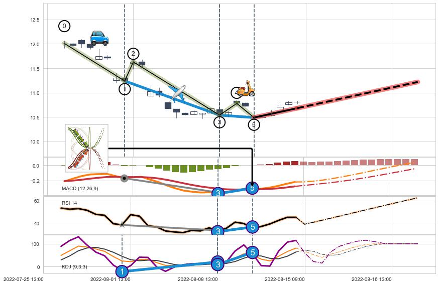 ➣ 1,3,5驱动浪MACD, RSI, KDJ走势都出现【常规背离】反转信号增强