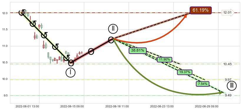 ➢ 循环浪继续向下【最低】位置(08-29:14, 9.49),匹配聚类样本比例19.44%, 可能性概率7.54%
