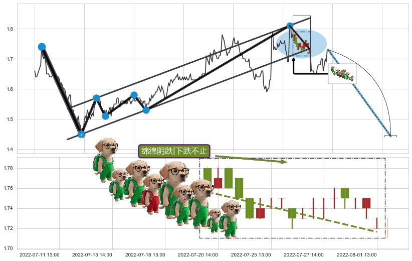 从2022-07-05 13:00至2022-08-03 14:00,共包含44个小时,阶段股价下跌-6.53%,阶段股价变动位移路程比: 1 : 5