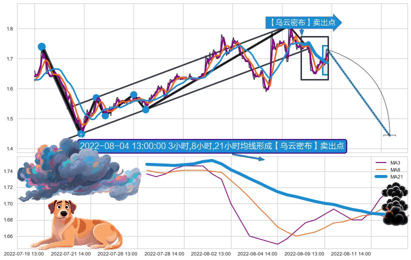 从2022-08-03 14:00至2022-08-12 14:00,共包含15个小时,阶段股价上涨4.82%,阶段股价变动位移路程比: 1 : 2