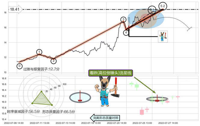 ➣ 看跌(高位倒锤头)流星线 + 波浪理论上涨浪临近浪5回调点信号叠加后【反向回撤率】极高,【看空】信号叠加【存续影响极小】