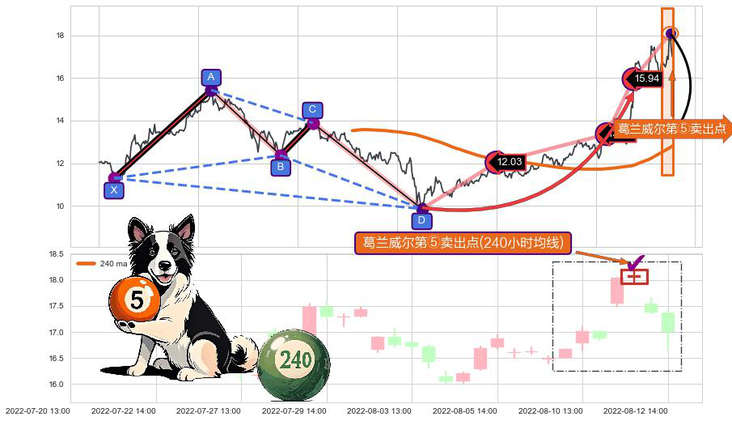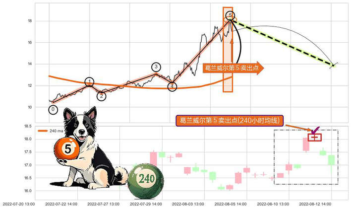 ➣ 🕰 价格走势在2022-08-05 14:00:00至2022-08-12 14:00:00期间形成葛兰威尔第⑤卖出点,残存影响值:-12.47