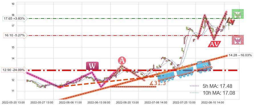 ♘ 阻力价格位17.65,可信任强度54.88%,距离最后交易2022-08-12 14:00形成的收盘价格17.00相差 +3.83%
