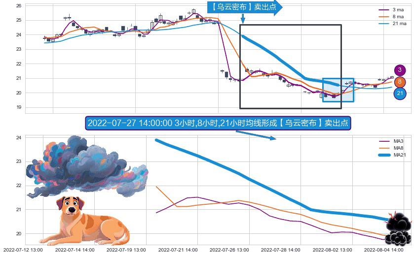 形态多维评估: ⚀ 2022-07-19 14:00:00小时-2022-08-04 13:00:00小时显现 3小时-8小时-21小时均线 【乌云密布】卖出点 看空信号,后市看跌,卖出