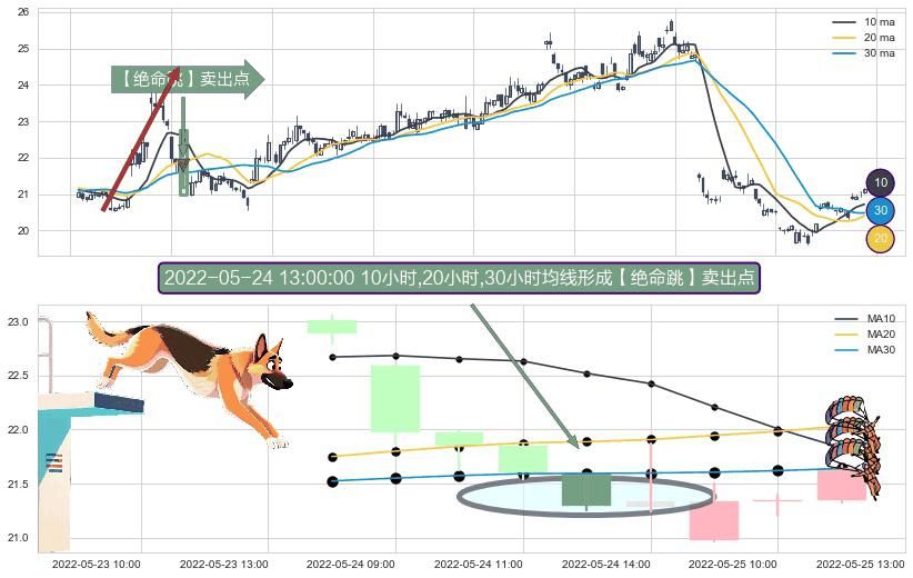 形态多维评估: ⚀ 2022-05-24 13:00:00小时显现 10小时-20小时-30小时均线 【绝命跳】卖出点 看空信号,后市看跌,卖出
