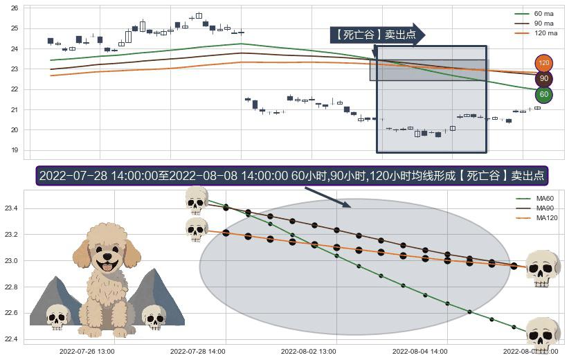 形态多维评估: ⚀ 2022-07-29 13:00:00-小时至2022-08-08 14:00:00-小时显现 60小时-90小时-120小时均线 【死亡谷】卖出点 看空信号,后市看跌,卖出
