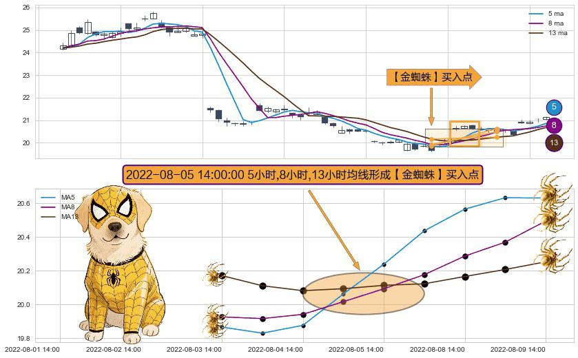 形态多维评估: ⚀ 2022-08-05 14:00:00小时显现 5小时-8小时-13小时均线 【金蜘蛛】买入点 看多信号,后市看涨,买入