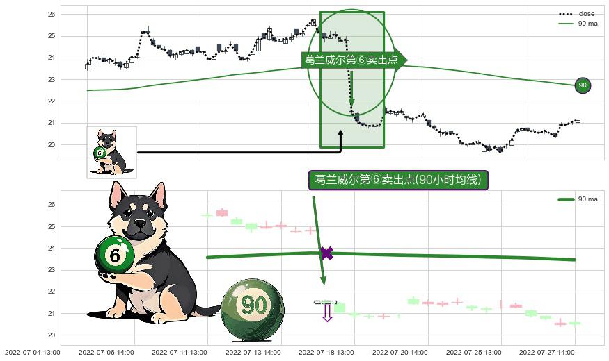 形态多维评估: ⚀ 2022-07-15 13:00:00-小时显现 葛兰威尔均线 90小时均线 第⑥卖出点 走势反转见顶信号,后市看跌,卖出信号