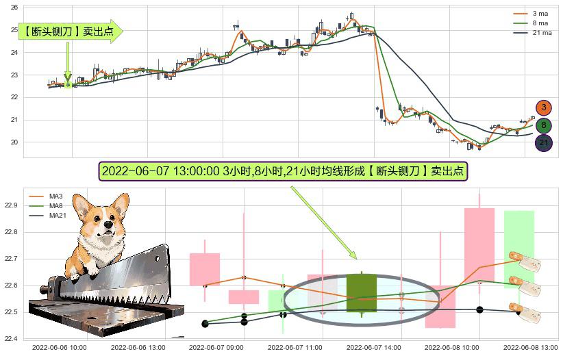 形态多维评估: ⚀ 2022-06-07 13:00:00小时显现 3小时-8小时-21小时均线 【断头铡刀】卖出点 看空信号,后市看跌,卖出