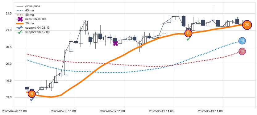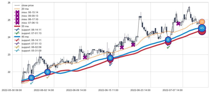上涨趋势05-30 09:00-07-14 14:00,均线45, 55确认关键支撑4处