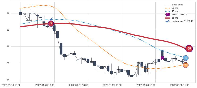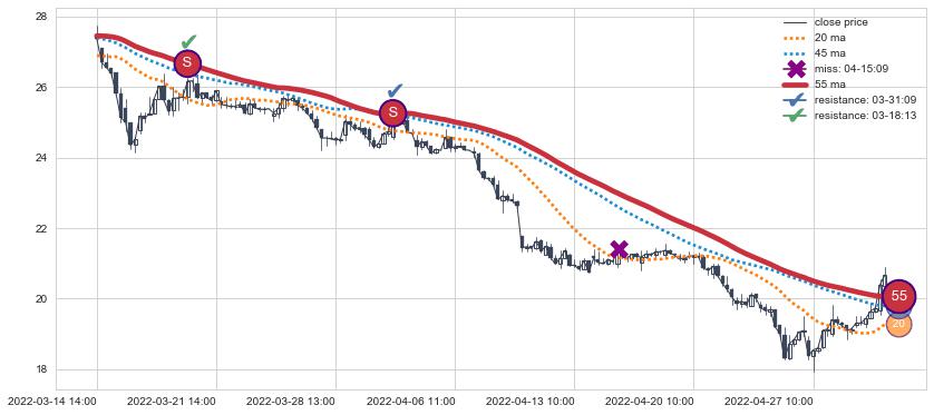 下跌趋势03-14 14:00-05-05 10:00,均线55确认关键阻力2处