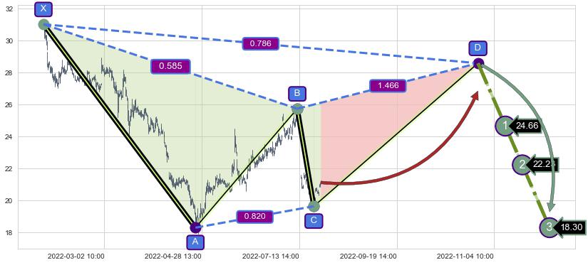 ➣ D点拟合预测价格28.58,距离最后交易收盘价格21.13相差 +35.28%
