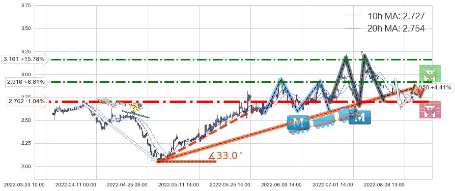 ♘ 阻力价格位2.916,可信任强度66.11%,距离最后交易2022-08-12 14:00形成的收盘价格2.730相差 +6.81%