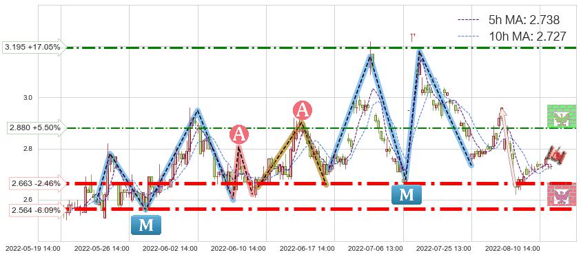 ♘ 阻力价格位3.195,可信任强度59.69%,距离最后交易2022-08-12 14:00形成的收盘价格2.730相差 +17.05%
