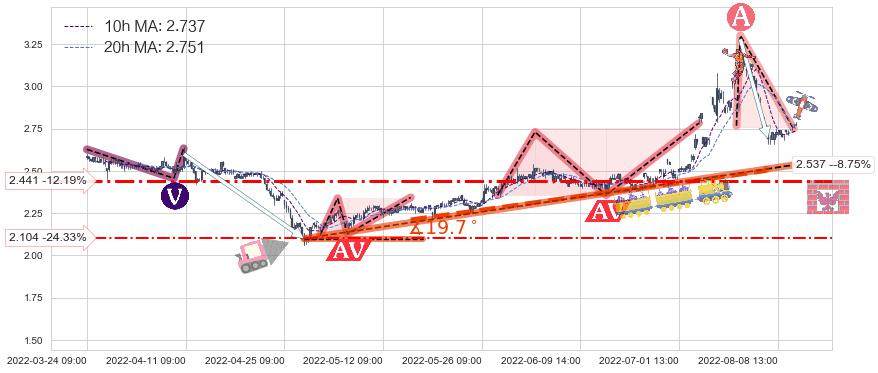 ♘ 在最后的上升阶段2022-04-27 09:00至2022-08-03 13:00存在 持续未破位的支撑位 ,支撑价格2.537,支撑可信任强度80.97%,其距离最后价格2.780相差 -8.75%