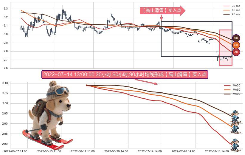 形态多维评估: ⚀ 2022-06-16 11:00:00小时-2022-08-12 14:00:00小时显现 30小时-60小时-90小时均线 【高山滑雪】买入点 看多信号,后市看涨,买入