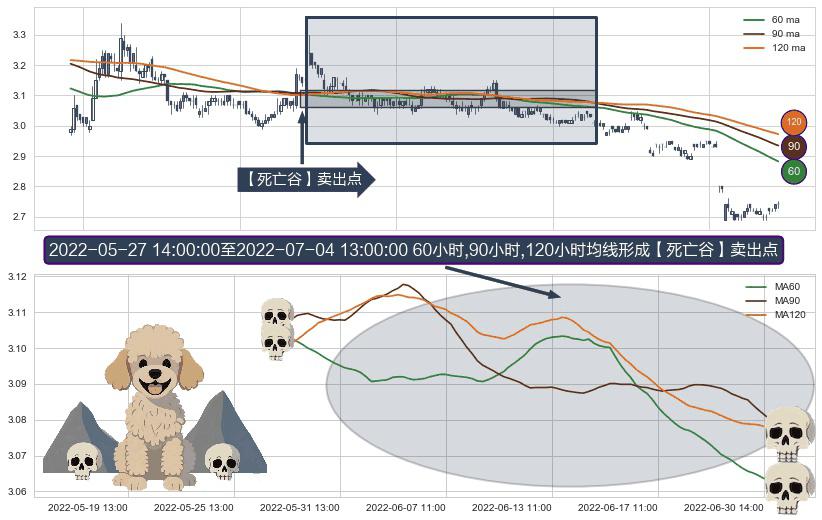 形态多维评估: ⚀ 2022-05-30 09:00:00-小时至2022-07-04 13:00:00-小时显现 60小时-90小时-120小时均线 【死亡谷】卖出点 看空信号,后市看跌,卖出