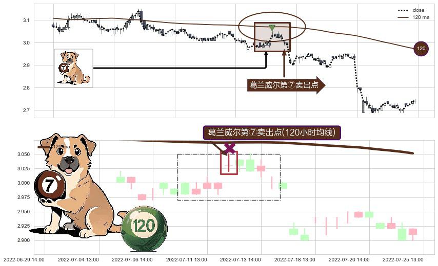 形态多维评估: ⚀ 2022-07-12 13:00:00-小时显现 葛兰威尔均线 120小时均线 第⑦卖出点 下降趋势的中继信号,后市看跌,卖出信号