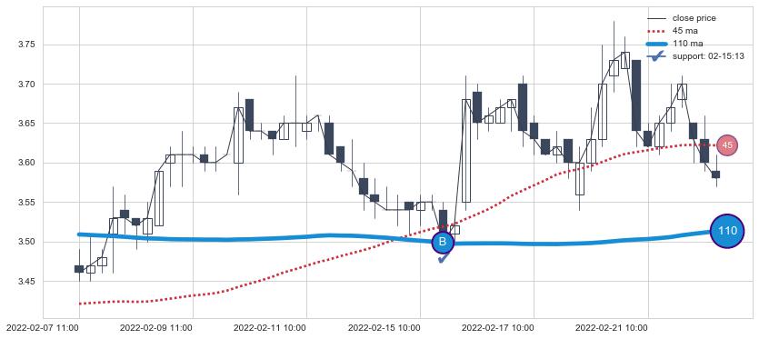 上涨趋势02-07 11:00-02-22 11:00,均线110确认关键支撑1处