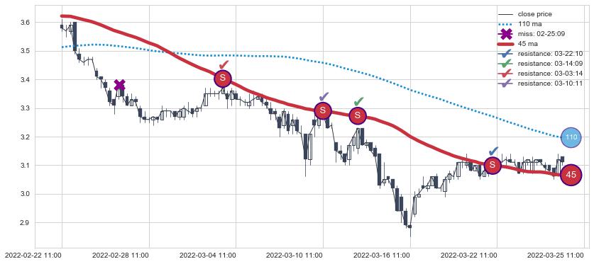 下跌趋势02-22 11:00-03-25 11:00,均线45确认关键阻力4处