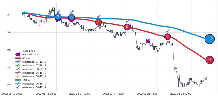 下跌趋势06-10 09:00-08-12 14:00,均线45, 110确认关键阻力5处