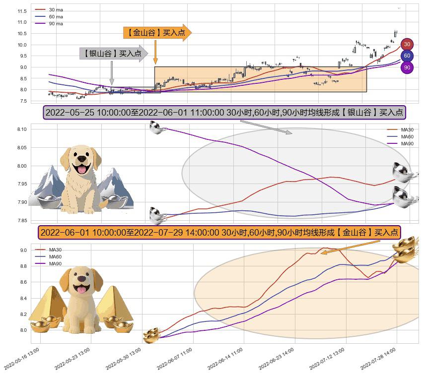 ⚀ 2022-06-01 11:00:00-小时至2022-07-29 14:00:00-小时显现 30小时-60小时-90小时均线 【金山谷】买入点 其再次确认了买入信号,可靠性更强,买入