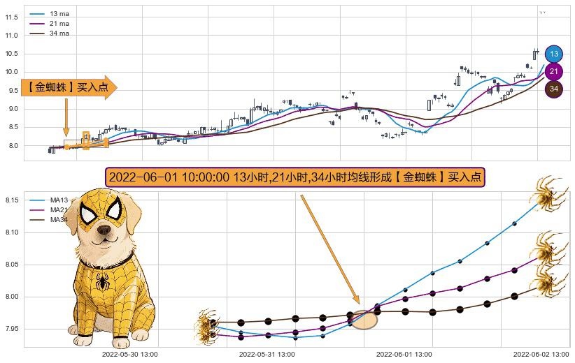 ⚀ 2022-06-01 10:00:00小时显现 13小时-21小时-34小时均线 【金蜘蛛】买入点 看多信号,后市看涨,买入