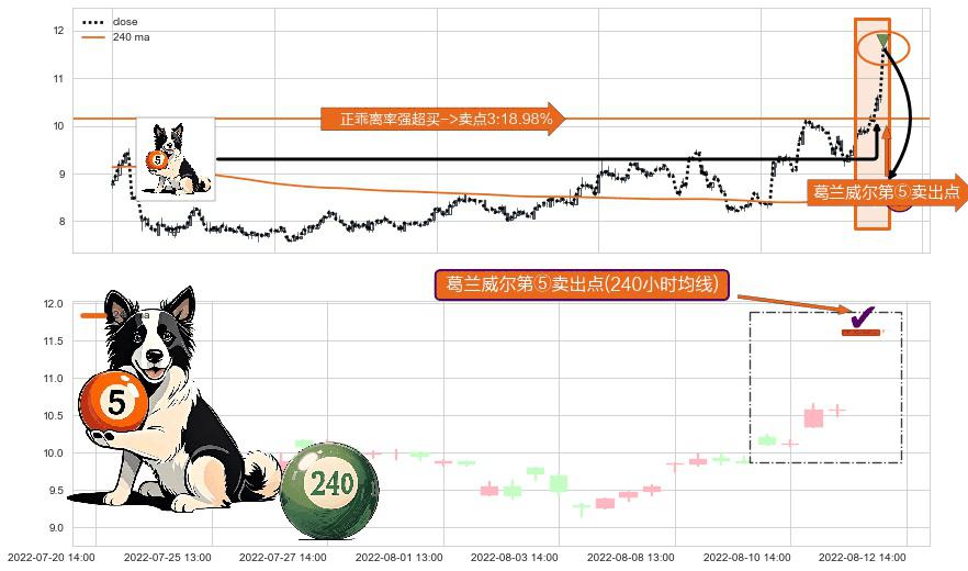 ⚀ 2022-08-12 13:00:00-小时显现 葛兰威尔均线 240小时均线 第⑤卖出点 上升趋势均值回复的短线回落信号,后市看跌,卖出信号