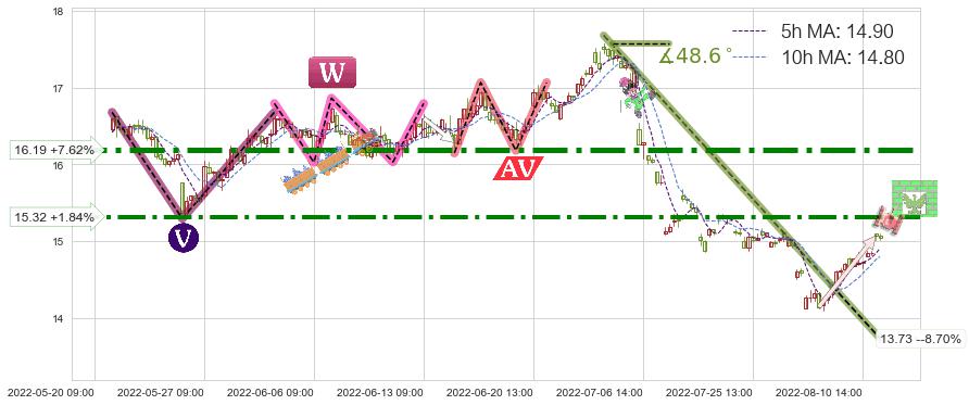 ♘ 阻力价格位15.32,可信任强度74.82%,距离最后交易2022-08-12 14:00形成的收盘价格15.04相差 +1.84%