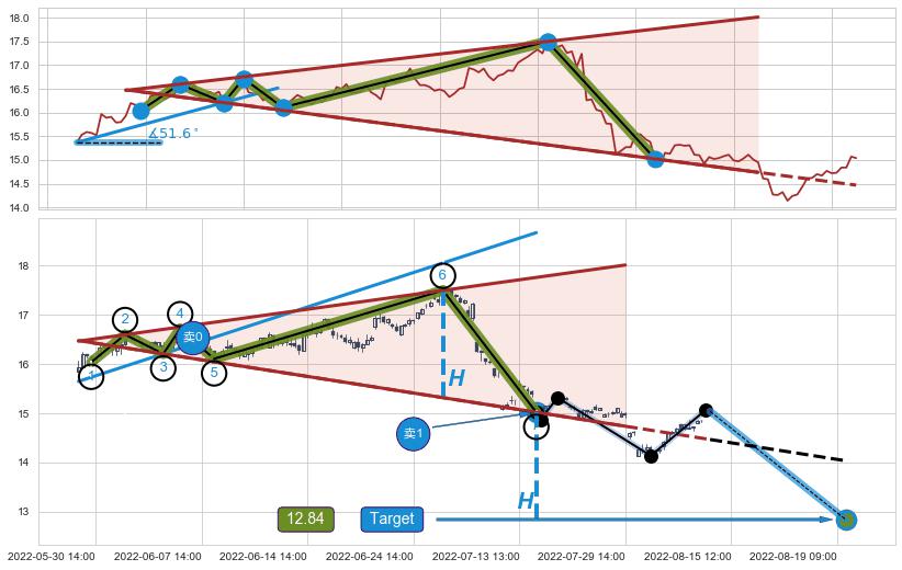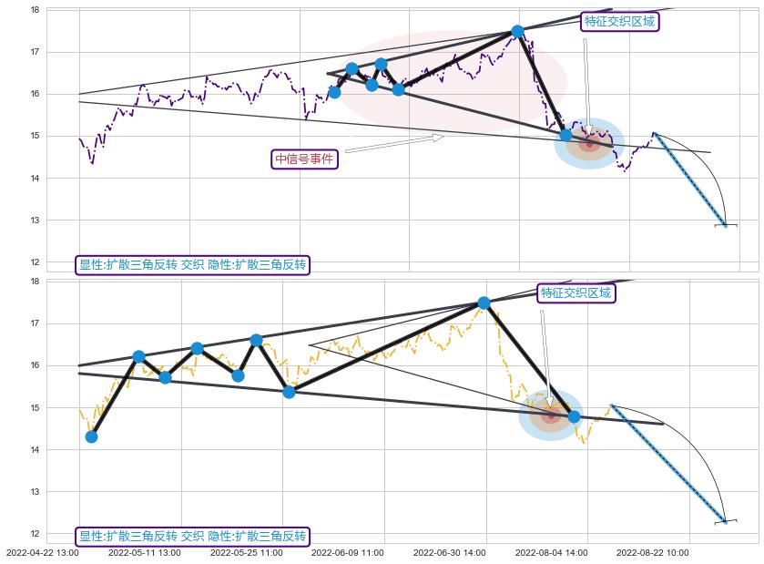 | 4 🅚:【战机起航】卖出点 ➕ 📐:扩散三角反转下行突破支撑位破位, 猜想持续下沉下跌,被突破的支撑位已变为阻力位 ☞ 看空信号 ⇥ 【均线】交织【图形】⇥ 综合量化分数: 49 | > |