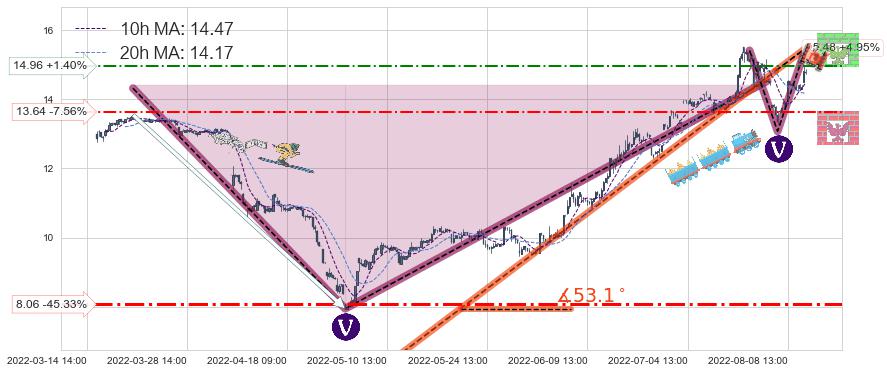 ♘ 阻力价格位14.96,可信任强度53.54%,距离最后交易2022-08-12 14:00形成的收盘价格14.75相差 +1.40%
