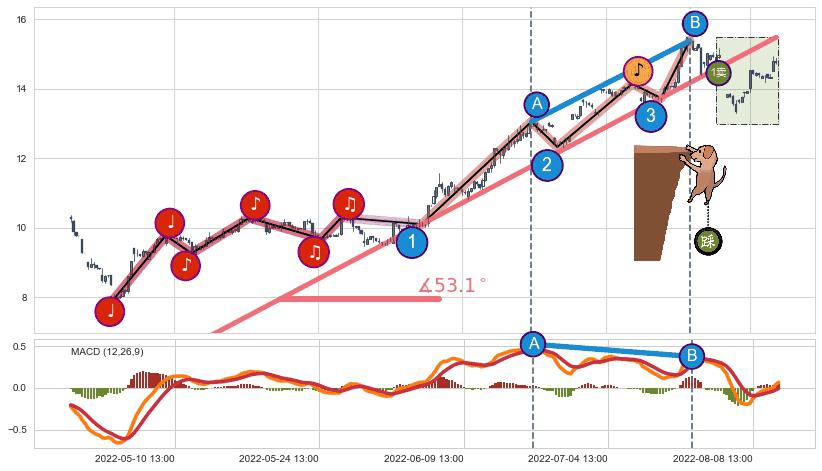 从2022-04-27 09:00至2022-08-03 13:00,共包含216个小时,阶段股价上涨56.12%,阶段股价变动位移路程比: 1 : 3,上涨趋势角度: 53.1