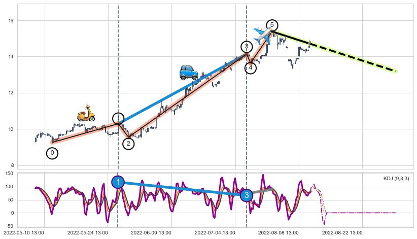 ➢ 第一, 三驱动浪端点:【KDJ】走势出现【常规背离 & 反转信号】背离程度51.98%,背离夹角角度67.0˚,背离程度中等