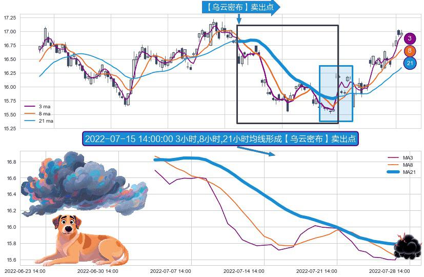 ⚀ 2022-07-05 13:00:00小时-2022-07-28 13:00:00小时显现 3小时-8小时-21小时均线 【乌云密布】卖出点 看空信号,后市看跌,卖出