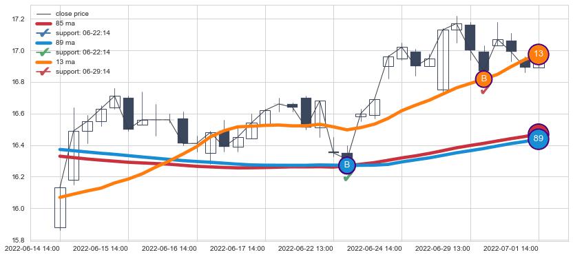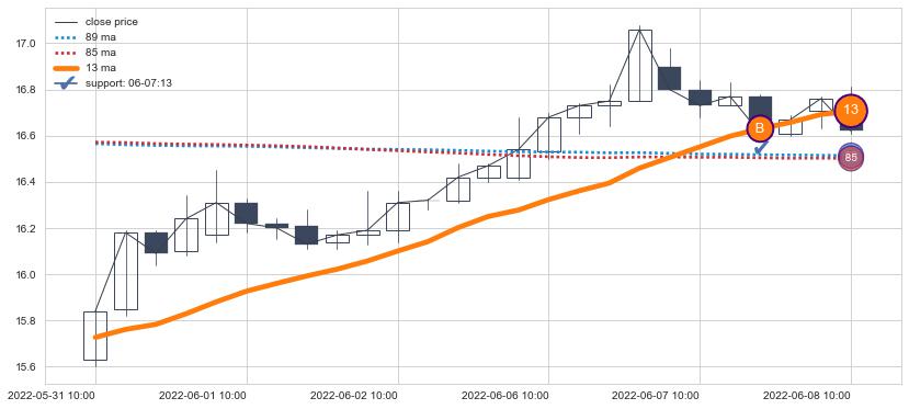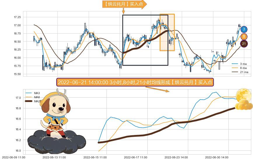 ⚀ 2022-06-15 09:00:00小时-2022-07-04 13:00:00小时显现 3小时-8小时-21小时均线 【烘云托月】买入点 看多信号,后市看涨,买入