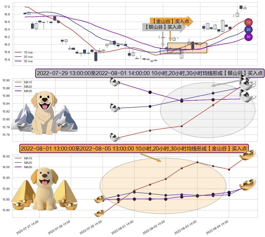 ⚀ 2022-08-01 14:00:00-小时至2022-08-05 13:00:00-小时显现 10小时-20小时-30小时均线 【金山谷】买入点 其再次确认了买入信号,可靠性更强,买入
