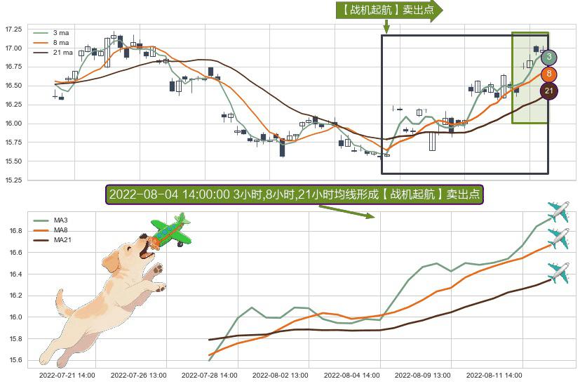 ⚀ 2022-07-27 14:00:00小时-2022-08-12 14:00:00小时显现 3小时-8小时-21小时均线 【战机起航】卖出点 看空信号,后市看跌,卖出