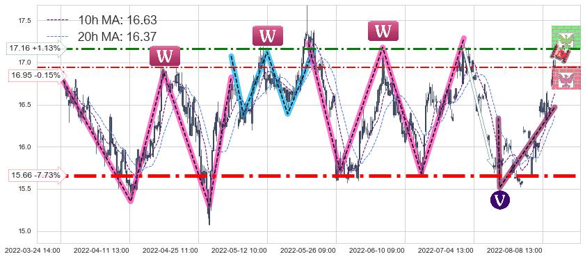 ♘ 阻力价格位17.16,可信任强度60.34%,距离最后交易2022-08-12 14:00形成的收盘价格16.97相差 +1.13%