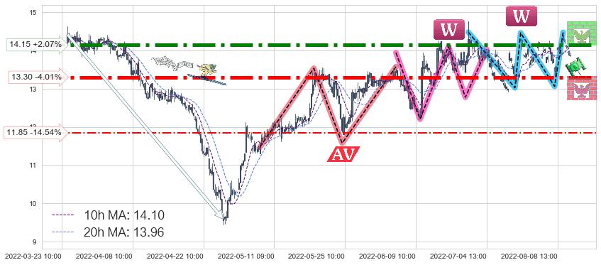 ♘ 阻力价格位14.15,可信任强度92.18%,距离最后交易2022-08-12 14:00形成的收盘价格13.86相差 +2.07%