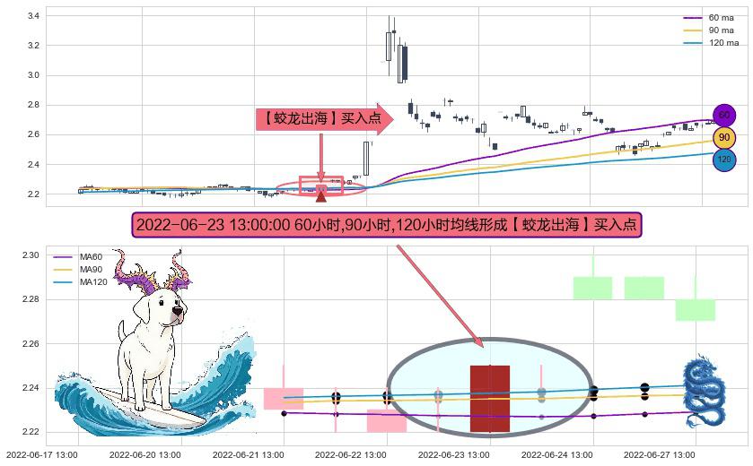 ⚀ 2022-06-23 13:00:00小时显现 60小时-90小时-120小时均线 【蛟龙出海】买入点 看多信号,后市看涨,买入