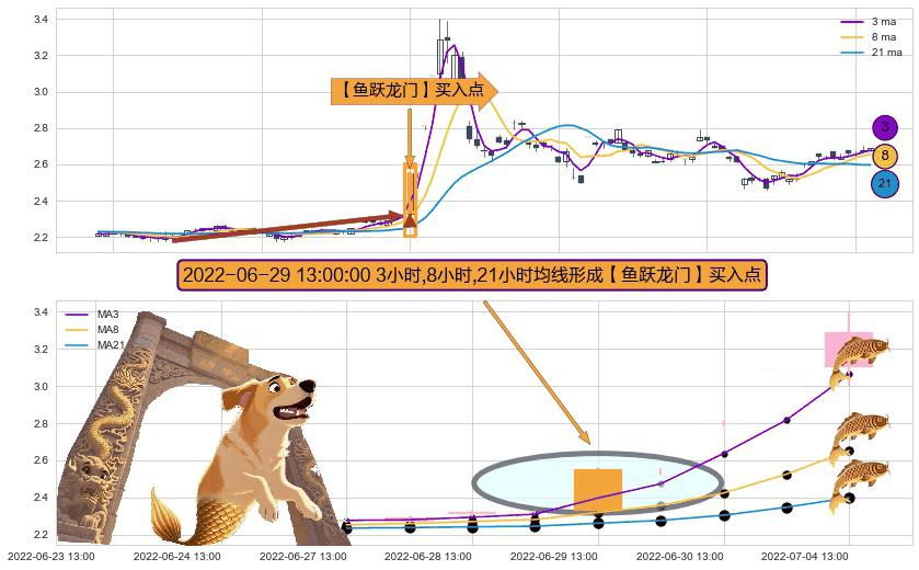 ⚀ 2022-06-29 13:00:00小时显现 3小时-8小时-21小时均线 【鱼跃龙门】买入点 看多信号,后市看涨,买入