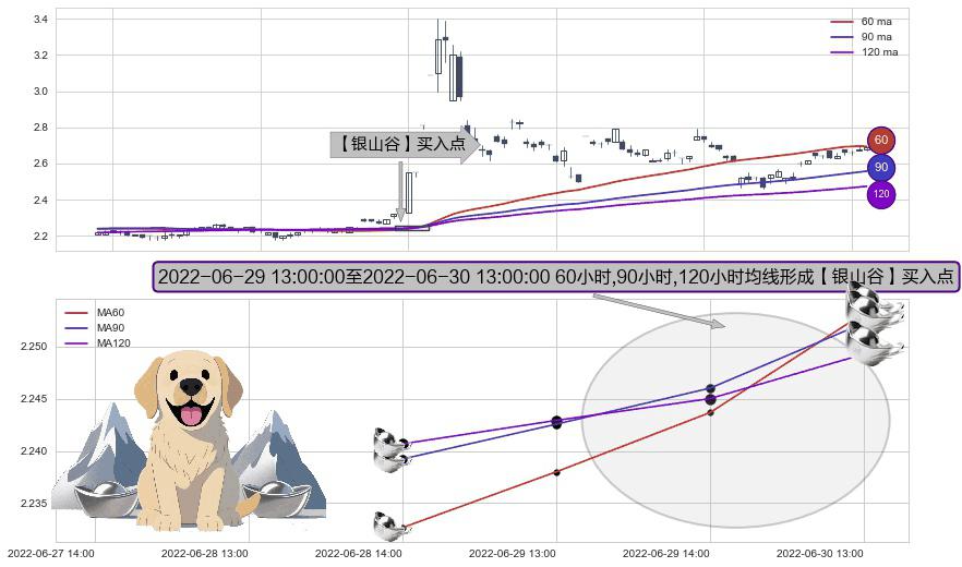 ⚀ 2022-06-29 14:00:00-小时至2022-06-30 13:00:00-小时显现 60小时-90小时-120小时均线 【银山谷】买入点 看多信号,后市看涨,买入